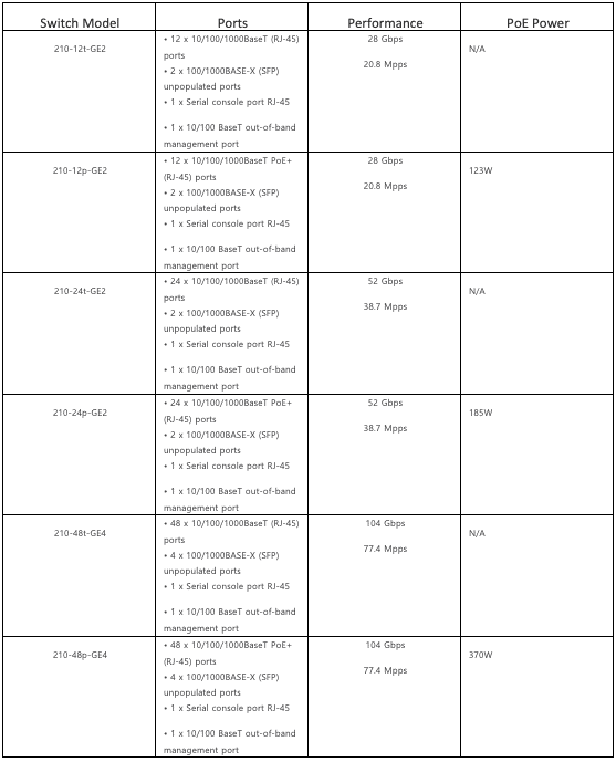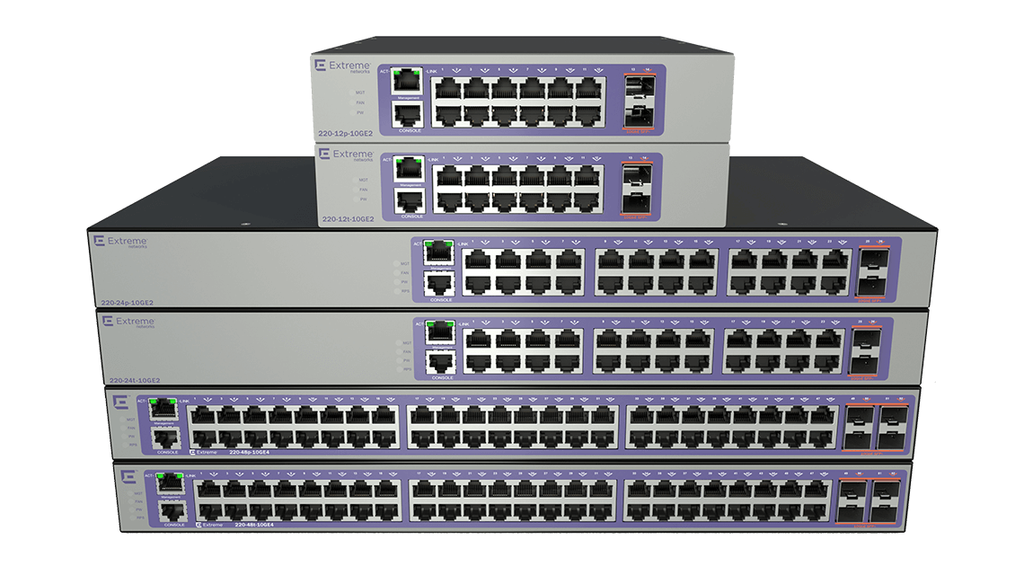 Seri, 12-, 24- ve 48-port GigabitEthernet anahtarları ve 12-, 24- ve 48-port Gigabit PoE + modelleri dahil olmak üzere altı anahtardan oluşur. Tüm modeller, bağlantı noktası performansı başına engellemesiz Gigabit sağlar ve fiber bağlantı için 2 veya 4 SFP bağlantı noktası içerir. Ek olarak, 12 bağlantı noktalı PoE + ve PoE + olmayan modeller fansız modda çalışabilir ve bu da onları ofis ortamları için ideal hale getirir. 210 Serisi ayrıca birden fazla yönetim seçeneği sunar. Anahtarlar bir web tarayıcısı aracılığıyla kurulabilir veya merkezi provizyon, izleme ve sorun giderme için Extreme Management Center tarafından yönetilebilir. Ve ileri düzey kullanıcılar için 210 Serisi, komut dosyası oluşturma özelliklerinin yanı sıra endüstri standardı bir CLI sunar. Her Ölçekteki İşletmeler İçin İdeal ExtremeSwitching 200 Serisi, esnek ancak yönetimi kolay bir çözümde temel özellikler arayan işletmeler, şubeler ve küçük ve orta ölçekli işletmeler için tasarlanmış ekonomik, sabit yapılandırmalı bir Gigabit Ethernet L2/L3 anahtar ailesidir. Çoklu Ofis Dağıtım Seçenekleri Seri, bağlantı noktası başına engellemesiz Gigabit performansı sağlar ve fiber bağlantı için 2 veya 4 SFP veya SFP + bağlantı noktası içerir. Ek olarak, 12 bağlantı noktalı PoE + ve PoE + olmayan modeller fansız modda çalışabilir ve bu da onları ofis dağıtımları için ideal hale getirir. Esnek Yönetim Seçenekleri 200 Serisi ayrıca, tek bir ekrandan kablolu ve kablosuz ağ denetimi için ExtremeCloud aracılığıyla bulut tabanlı yönetim dahil olmak üzere birden çok yönetim seçeneği sunar. Anahtarlar ayrıca bir web tarayıcısı aracılığıyla kurulabilir veya merkezi provizyon, izleme ve sorun giderme için ExtremeManagement tarafından yönetilebilir.